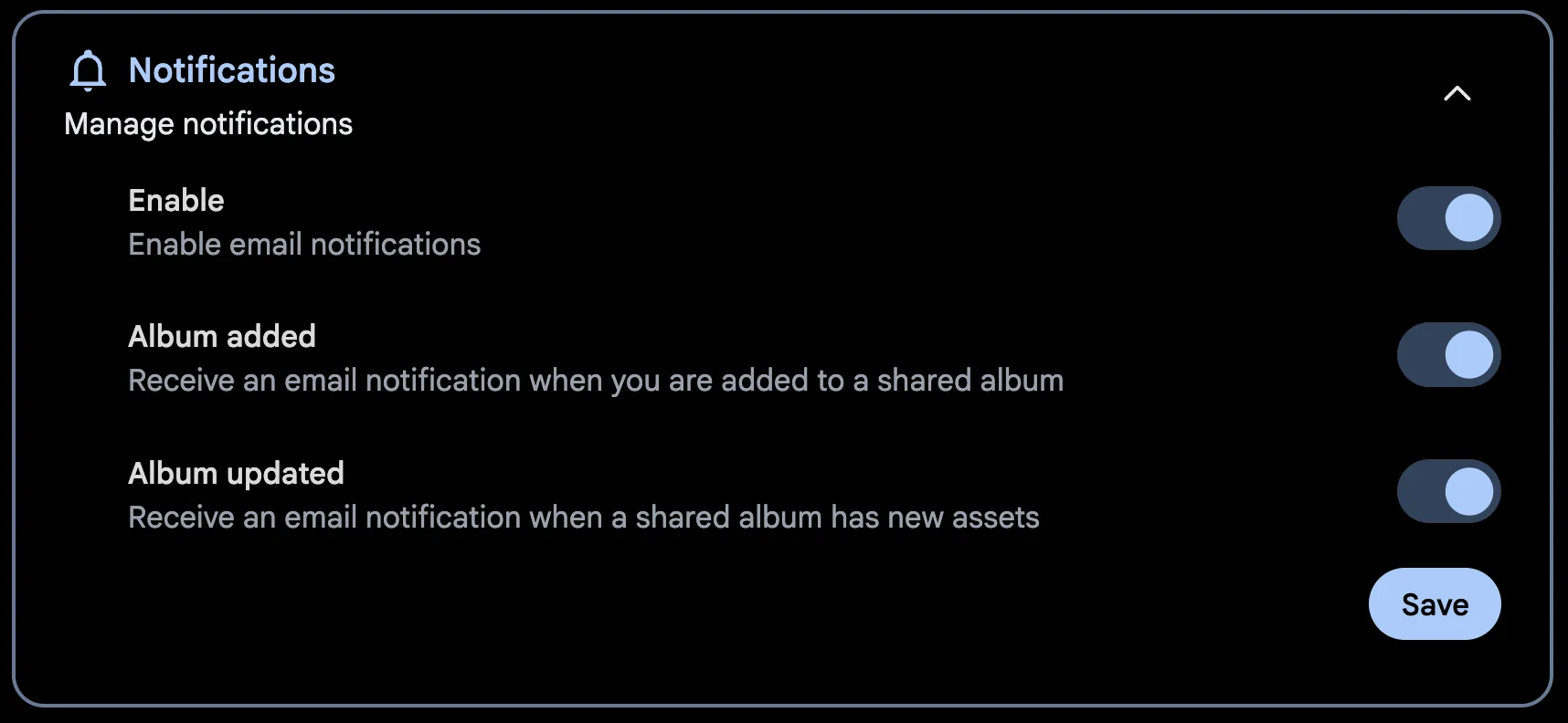 Users can manage their email notification settings from their account settings page on the web. They can choose to turn email notifications on or off for the following events: