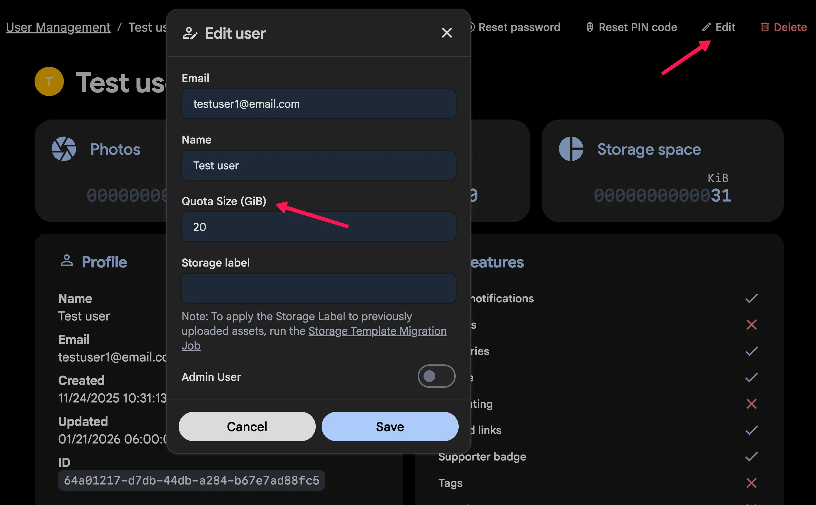 In order to select a storage quota, click on the edit user icon and enter the storage quota in GiB. You can choose an unlimited quota by leaving it empty (default).