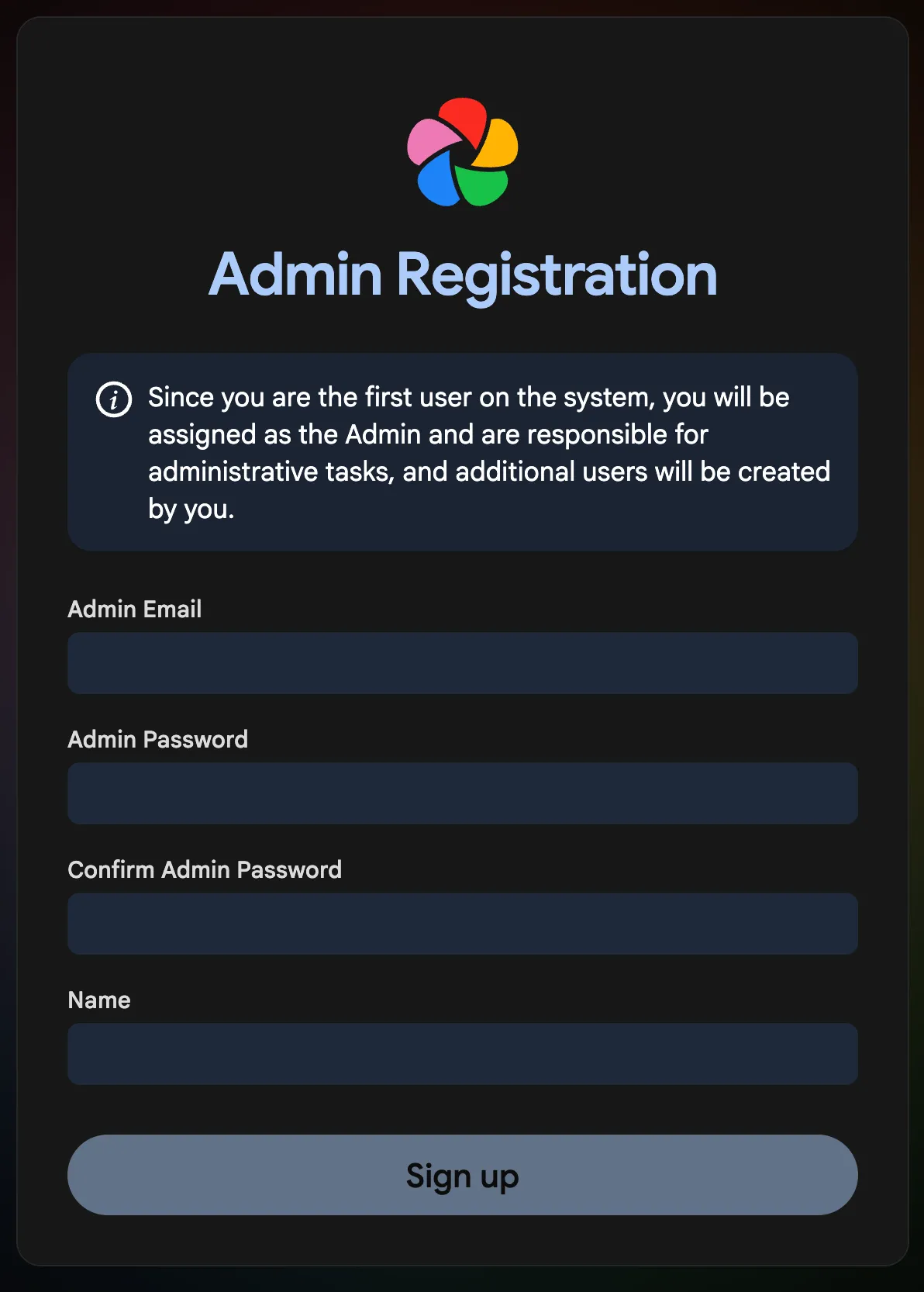 The first user to register will be the admin user. The admin user will be able to add other users to the application.